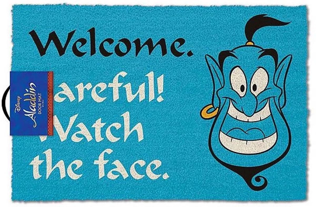 Dit is een deurmat met opdruk van Aladdin met de tekst “Welcome, Careful! Watch the face.”