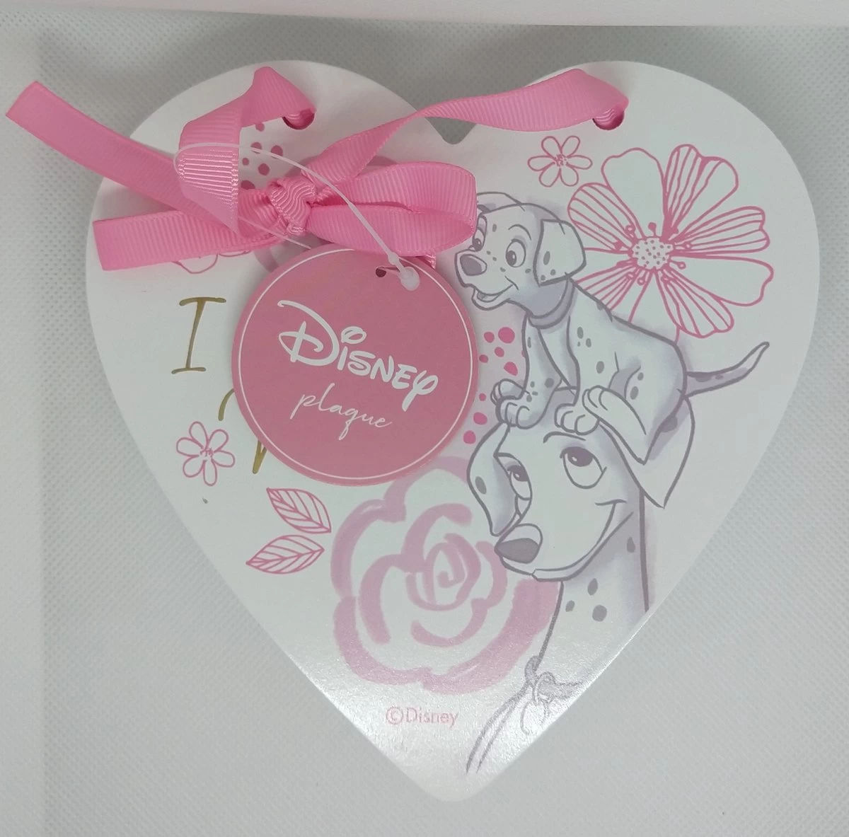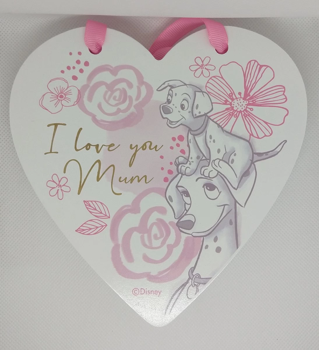 Schattig houten hart uit de 101 Dalmatiërs collectie, om op te hangen aan een roze satijnen lint. Met een mooie afbeelding en de woorden: “I love you Mum”.