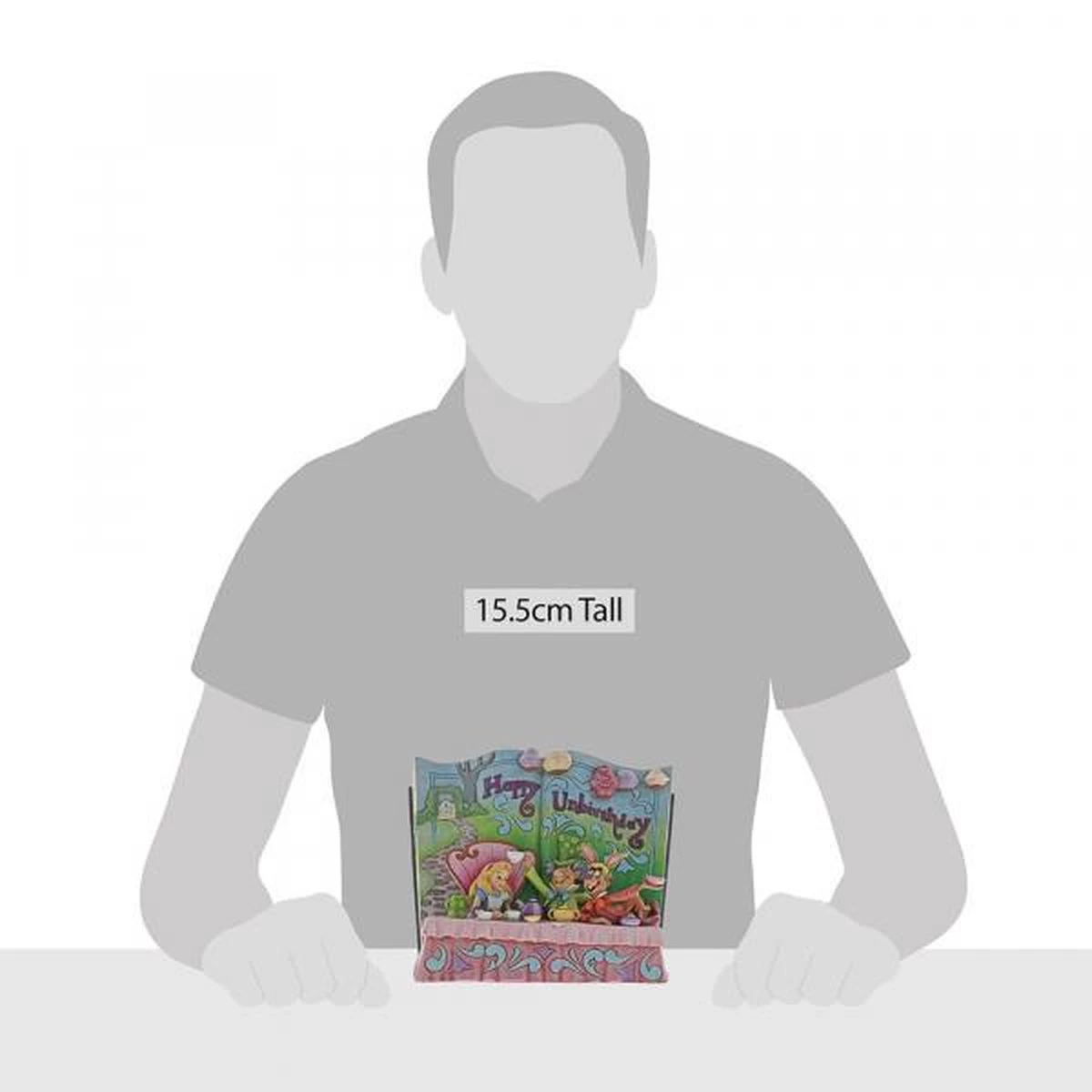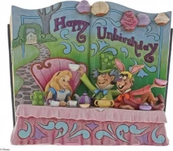 Storybook Alice in Wonderland Happy Unbirthday van Jim Shore, in de Disney Traditions lijn. Volledig handbeschilderd. Dit is een herintroductie. Het eerste storybook had de tekst Merry Unbirthday en is zeldzaam en wordt voor veel hogere prijzen verkocht.