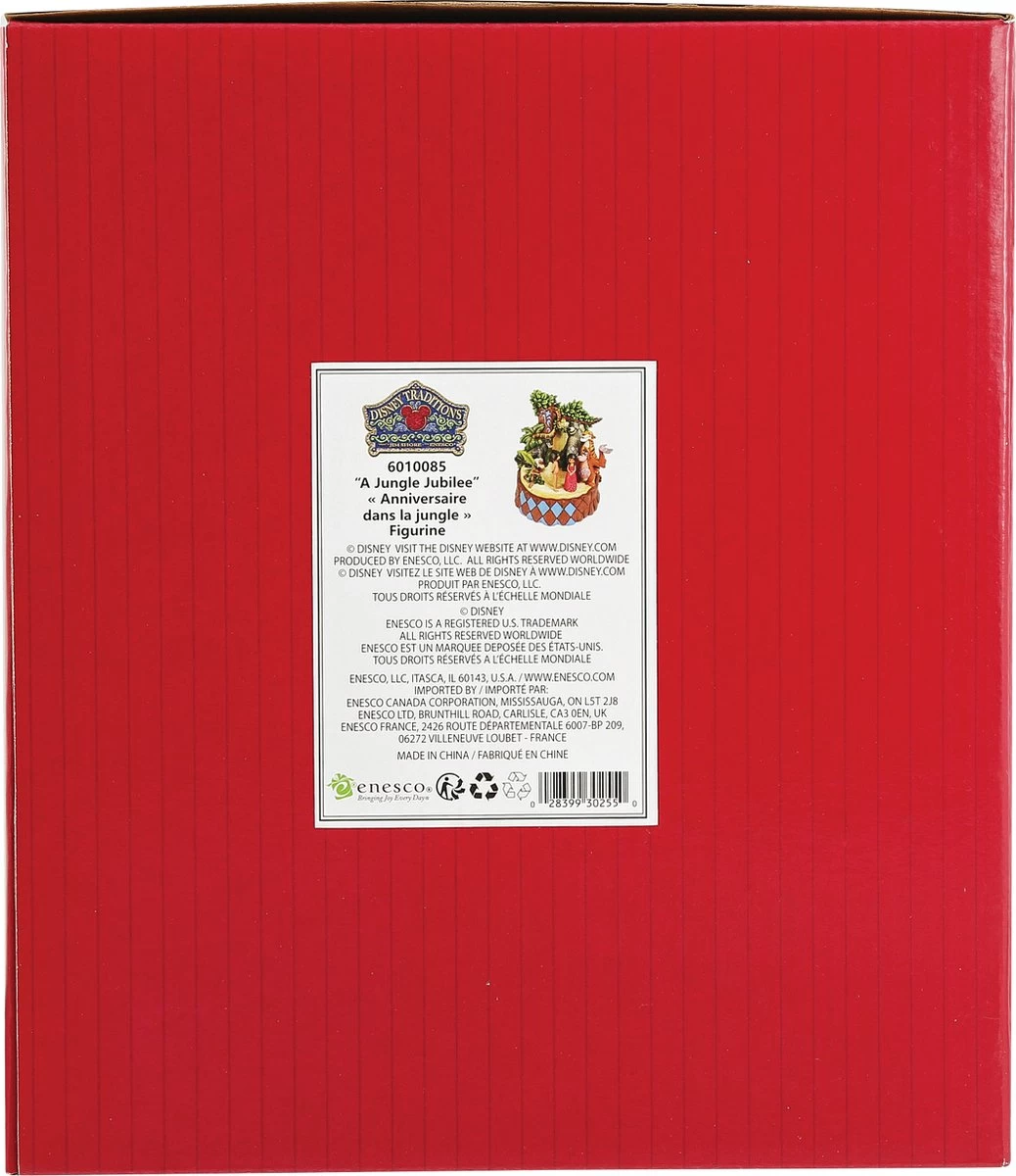 Jungle Book Carved by Heart. Vier het 55-jarig jubileum van Disney’s Jungle Book. Mowgli en vrienden komen samen om dit feest vieren…zelfs de Villains Shere Khan en Kaa nemen deel aan de festiviteiten en begraven de strijdbijl met Baloo en Bagheera op deze herdenkingsdag. Met dit beeldje haalt u een stukje Disney Magie in huis. Disney Traditions by Jim Shore-beeldjes worden al jaren ontworpen de gelijknamige Amerikaanse kunstenaar. Hij staat bekend om zijn quilt-achtige patronen en kleurgebruik. Zijn creaties lijken uit hout gesneden, maar worden van Polyresin vervaardigd en zijn stuk voor stuk handbeschilderd. Minimale kleurverschillen kunnen dus voorkomen. De warme, nostalgische uitstraling van de beeldjes zorgt voor een grote schare liefhebbers en verzamelaars uit alle lagen van de bevolking en over de hele wereld. De Disney-creaties van Jim Shore zijn gelicenseerd en worden geproduceerd door Enesco. Ieder beeldje wordt in een op-maat-gemaakte verpakking geleverd.