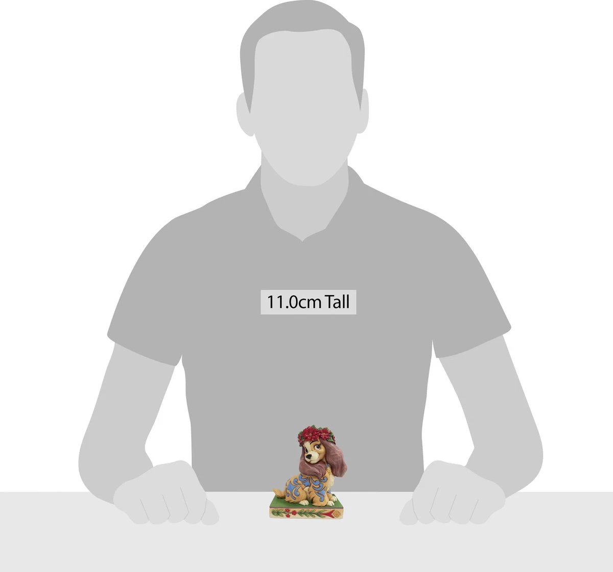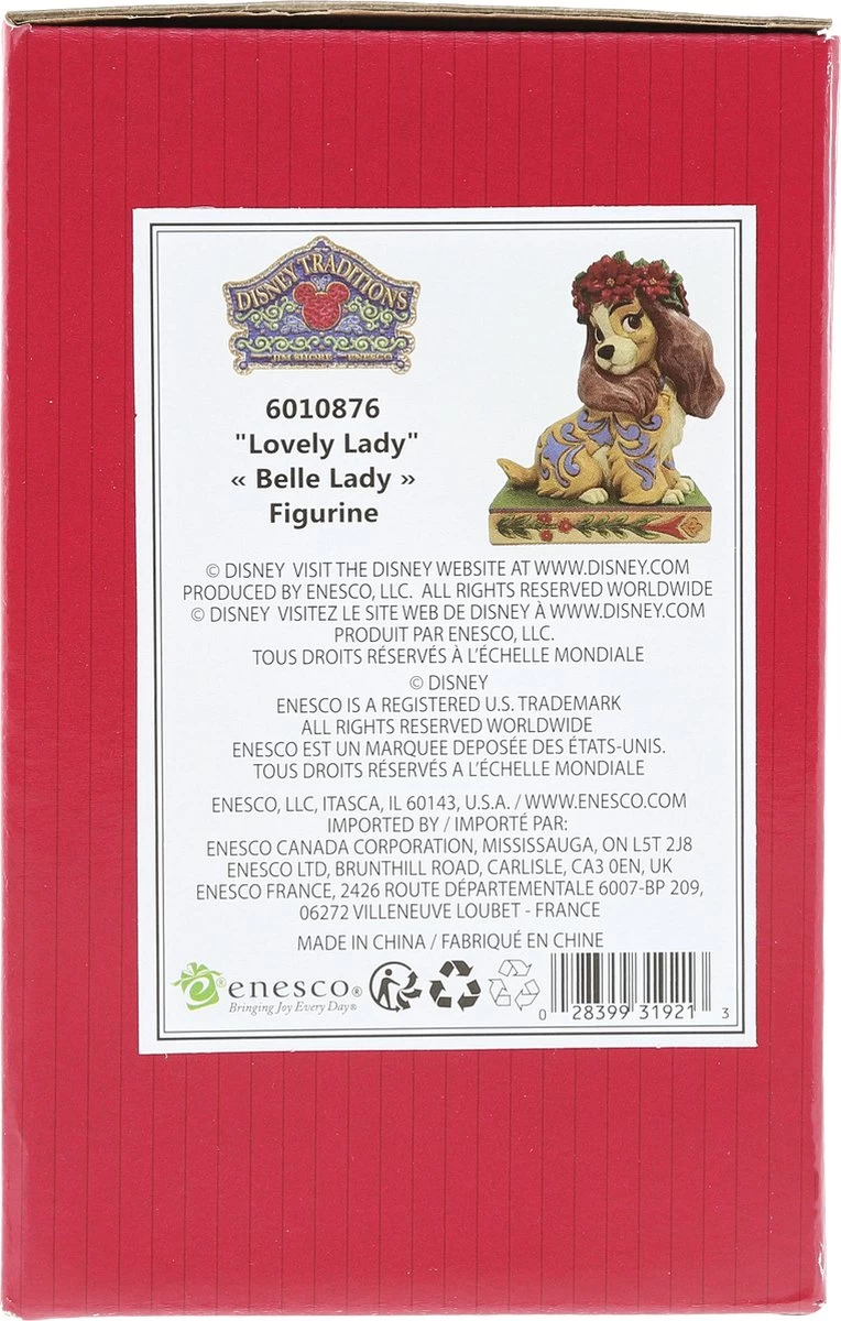 Lovely Lady / Christmas Lady. Schattig beeldje van de Cocker Spaniel uit Disney’s Lady & the Tramp. Lady heeft een prachtige krans met kerststerren op haar kop. Met dit beeldje haalt u een stukje Disney Magie in huis. Disney Traditions by Jim Shore-beeldjes worden al jaren ontworpen de gelijknamige Amerikaanse kunstenaar. Hij is staat bekend om zijn quilt-achtige patronen en kleurgebruik. Zijn creaties lijken uit hout gesneden, maar worden van Polyresin vervaardigd en zijn stuk voor stuk handbeschilderd. Minimale kleurverschillen kunnen dus voorkomen. De warme, nostalgische uitstraling van de beeldjes zorgt voor een grote schare liefhebbers en verzamelaars uit alle lagen van de bevolking en over de hele wereld. De Disney-creaties van Jim Shore zijn gelicenseerd en worden geproduceerd door Enesco. Ieder beeldje wordt in een op-maat-gemaakte verpakking geleverd.