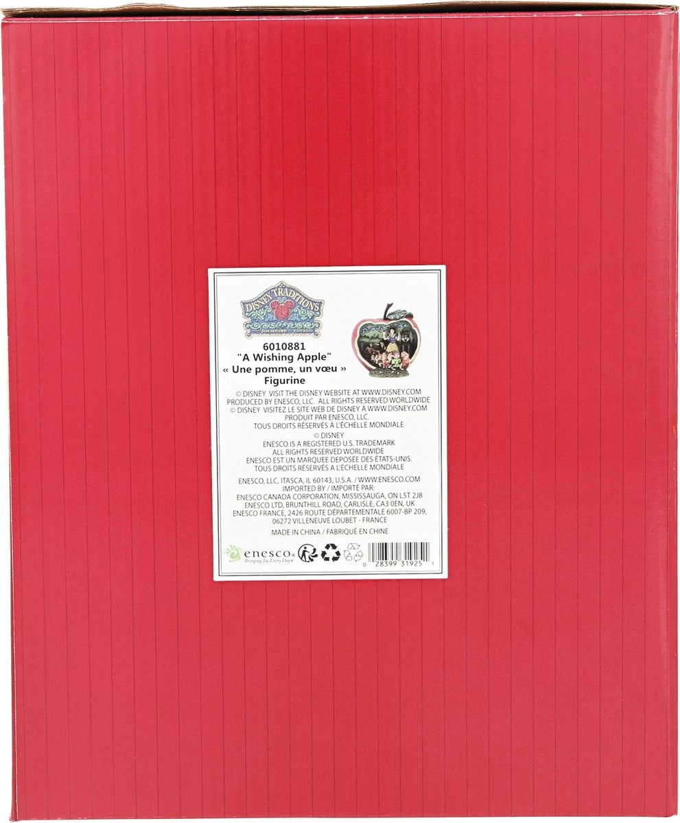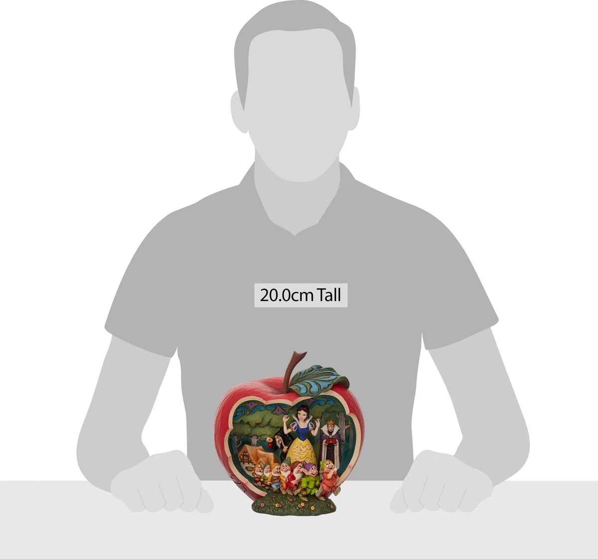 Snow White Apple Scene Masterpiece. Dit betoverende bostafereel, omlijst door een gehalveerde appel, verzamelt alle personages van de Disney-klassieker uit 1937, Sneeuwwitje. Sneeuwwitje lacht samen met de zeven dwergen, die zich niet bewust zijn van de gevaren die hen omringen, terwijl de Boze Koningin dreigt met de vergiftigde appel in dit spectaculaire meesterwerk. Met dit beeldje haalt u een stukje Disney Magie in huis. Disney Traditions by Jim Shore-beeldjes worden al jaren ontworpen de gelijknamige Amerikaanse kunstenaar. Hij is staat bekend om zijn quilt-achtige patronen en kleurgebruik. Zijn creaties lijken uit hout gesneden, maar worden van Polyresin vervaardigd en zijn stuk voor stuk handbeschilderd. Minimale kleurverschillen kunnen dus voorkomen. De warme, nostalgische uitstraling van de beeldjes zorgt voor een grote schare liefhebbers en verzamelaars uit alle lagen van de bevolking en over de hele wereld. De Disney-creaties van Jim Shore zijn gelicenseerd en worden geproduceerd door Enesco. Ieder beeldje wordt in een op-maat-gemaakte verpakking geleverd.